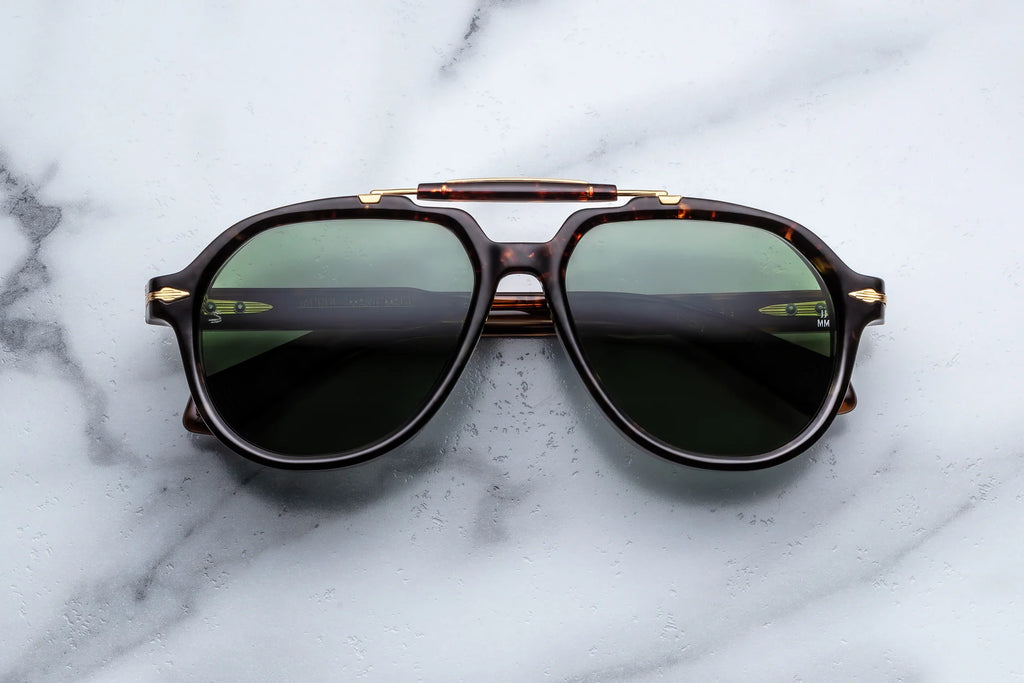 MATERIAL: 10MM CURED CELLULOSE ACETATE FRAME IN POLISHED HAVANA, WITH CUSTOM DOUBLE-LAMINATED TEMPLES, COMPOSED OF CLEAR BEIGE EXTERIORS & HAVANA INTERIORS. HARDWARE: DK. GOLD - LENS: TAMARACK GREEN POLARISED CR39 - HANDCRAFTED IN JAPAN