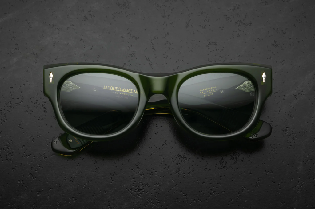 MATERIAL: GREEN 10MM CURED CELLULOSE ACETATE FRAME WITH CRIMSON INNER TEMPLES, CUSTOM DOUBLE LAMINATED ACETATE TEMPLES FT. PRECIOUS METAL HARDWARE